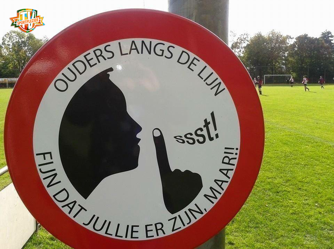 Verkeersbord met de tekst “ouders langs de lijn fijn dat jullie er zijn, maar SSST!” – Bron: TVsportplezier